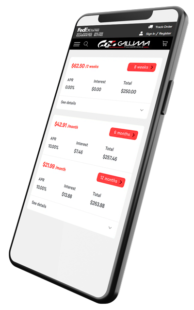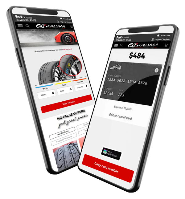 With Galuma Tires & Wheels, there’s no need to wait to get the tires you need. We offer a variety of flexible payment options to make your shopping experience as convenient as possible. You can pay for your purchase using major credit cards, including Visa, MasterCard, and American Express, Cash On Site, Amazon Pay, all Stripe services, Afterpay and Affirm. No matter which method you choose, you can shop with confidence knowing your transactions are safe and secure.